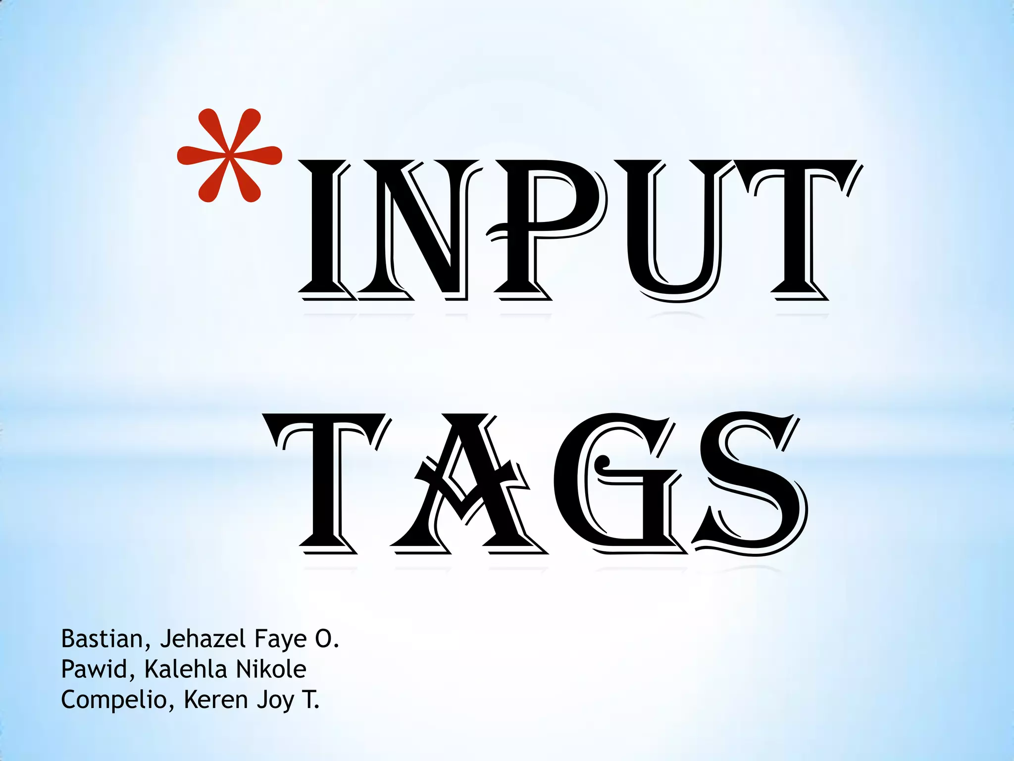 The HTML <input> tag is used to create different form control elements. The type attribute determines what kind of input is created, such as text, password, checkbox, radio button, submit button, reset button, hidden, file, image, or button. Common input types include text for single-line text entry, password to hide text, checkbox for multiple selections, radio for single selections from options, and submit/reset buttons.