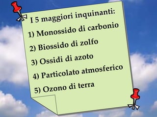 Il documento discute l'inquinamento atmosferico, evidenziando le principali fonti sia naturali che umane, inclusi eventi come tempeste di sabbia e attività industriali. Si approfondiscono specifici inquinanti come il monossido di carbonio, il biossido di zolfo e gli ossidi di azoto, con un focus sui loro effetti nocivi sulla salute umana e sull'ambiente. Viene infine sottolineata l'importanza della protezione dell'atmosfera e lo stato critico dell'aria che respiriamo.