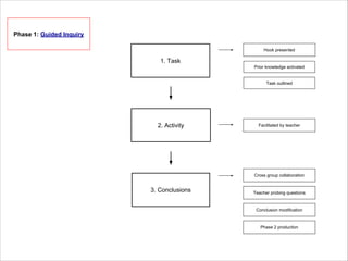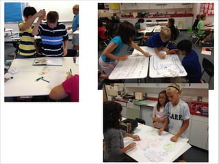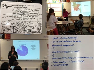The document discusses inquiry-based learning techniques in 5th and 6th grade social studies, highlighting the explore-flip-apply model which involves engaging students through primary sources and critical thinking. It presents various projects, such as exploring Africa's early cultures and global warming, illustrating how students can synthesize information and apply their understanding in meaningful ways. Additionally, it includes resources for educators to enhance their teaching methods in social studies.