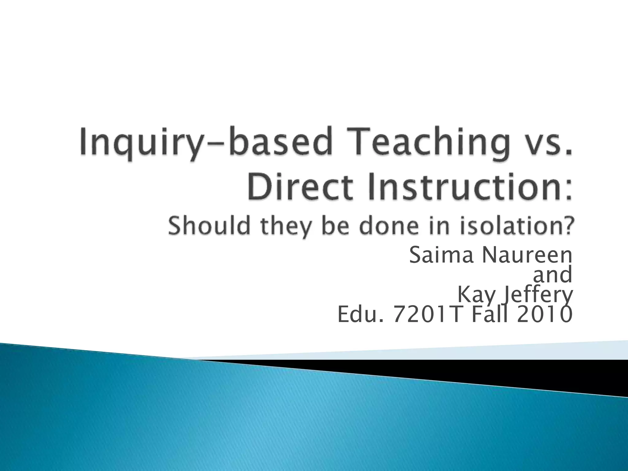 This document discusses research on the inquiry method versus direct instruction method of teaching science. It provides background on the problem, a literature review on the benefits and drawbacks of each method, and influential learning theorists such as Dewey and Vygotsky. The authors hypothesize that combining inquiry and direct instruction into an integrated curriculum will improve student performance and independence over using either method alone. They plan to test this with three kindergarten groups, each taught science using a different method, over six weeks.