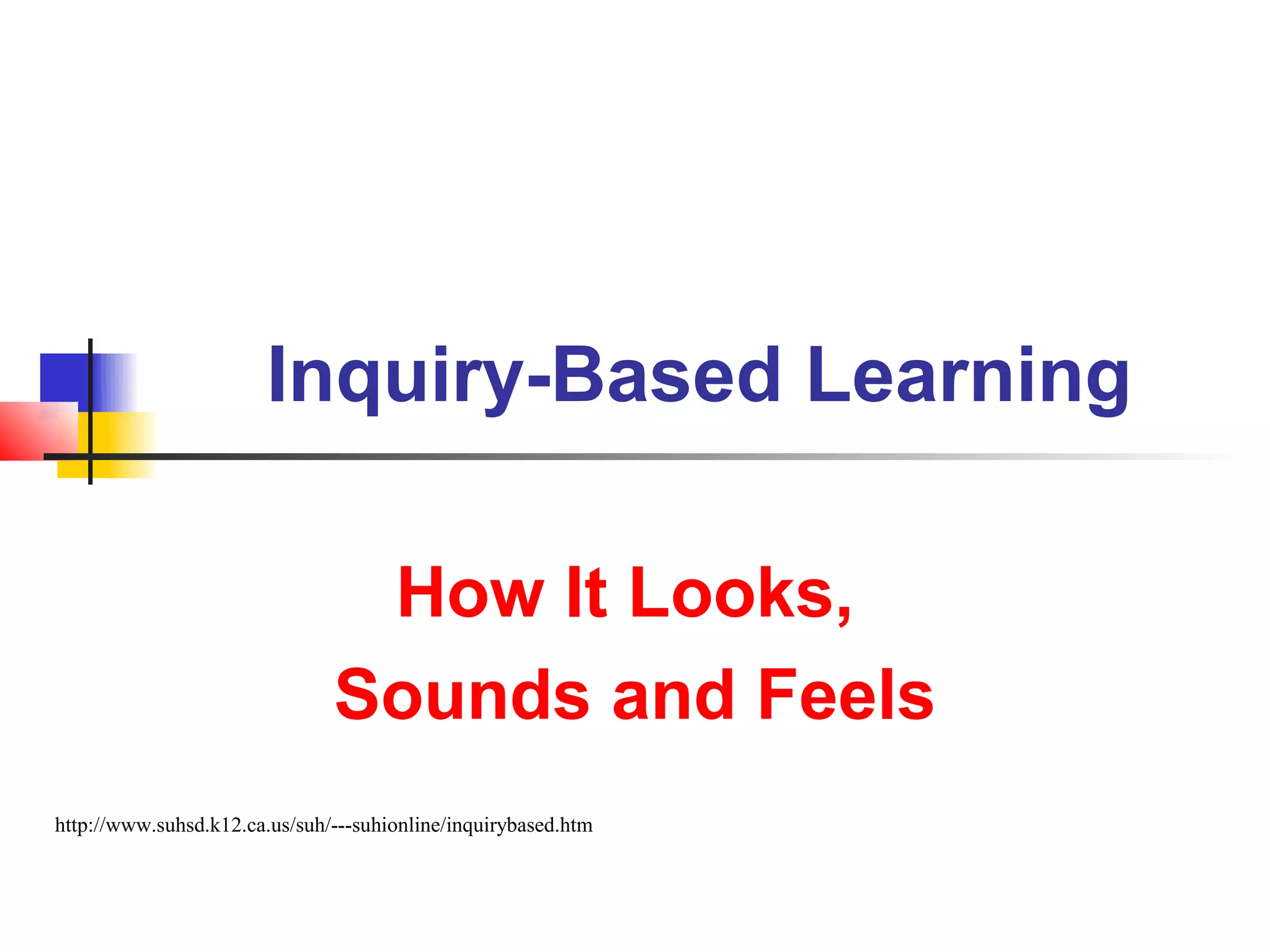 The document describes inquiry-based learning and how it differs from traditional education. Inquiry-based learning is more student-centered and focuses on developing skills like problem-solving over mastery of content. It emphasizes how knowledge is acquired rather than just facts. Students are actively involved in constructing their own understanding through hands-on projects, asking questions, and utilizing a variety of resources. The teacher acts as a facilitator rather than dispenser of knowledge. Inquiry teaching aims to help students learn how to continue learning on their own.