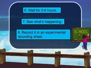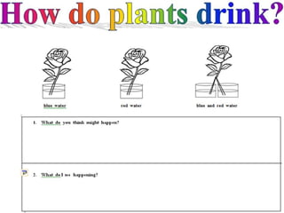 This document provides instructions for an experiment to observe how plants drink water. Students will place white roses in cups of colored water to see how the water travels up the stem. The objectives are to understand what plants need to grow healthily and learn that plants require water. By observing the roses over time, students can see that flowers drink water through capillary action as it moves up narrow tubes in the stem.
