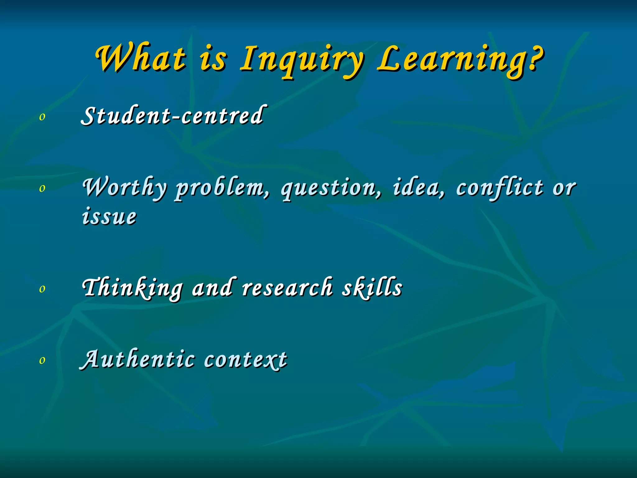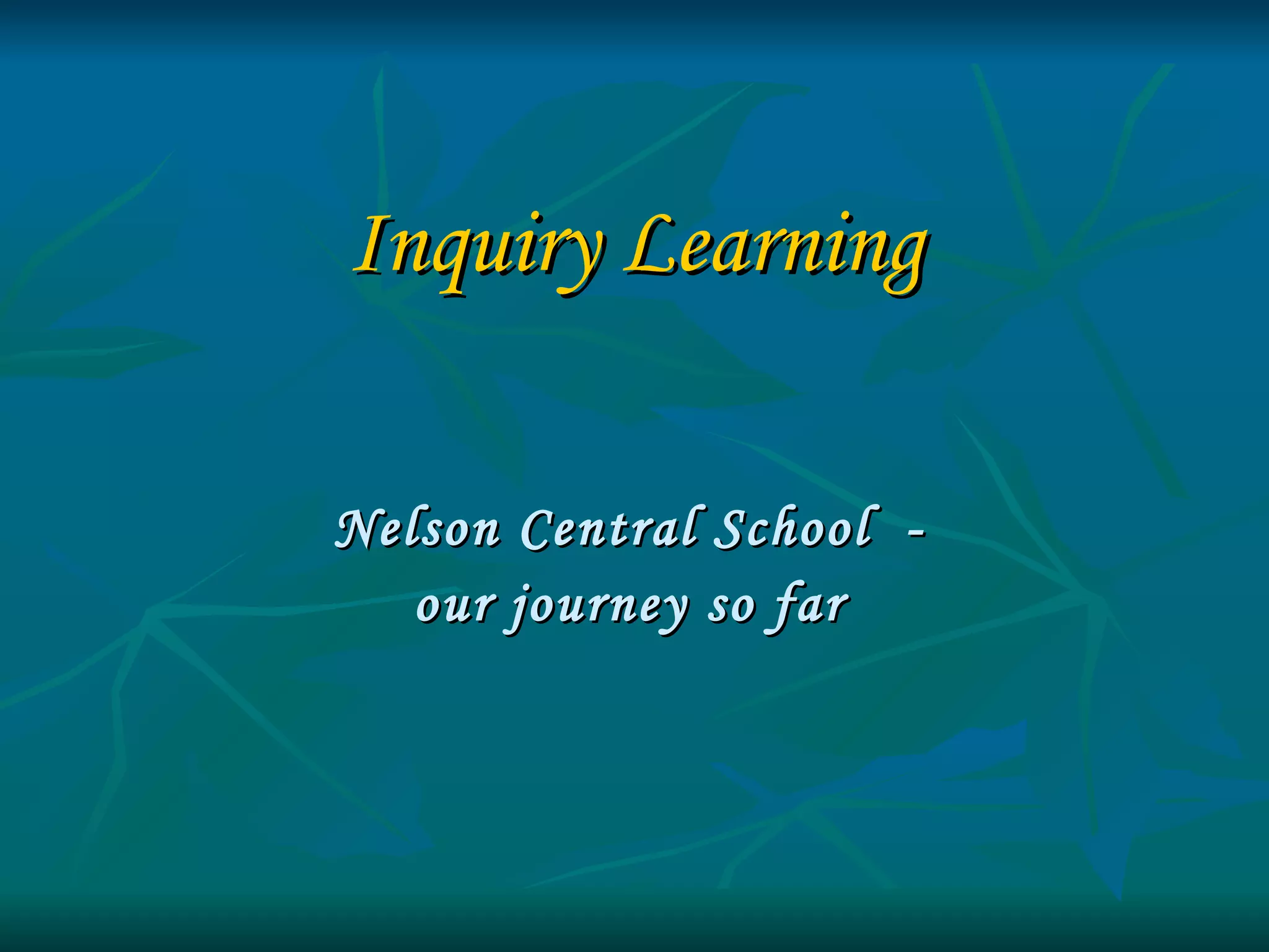 The document describes the journey of Nelson Central School in New Zealand in implementing an inquiry learning model. It discusses why the school moved to inquiry learning, focusing on developing students' research, thinking and lifelong learning skills. The school adopted the SAUCE model of inquiry which involves setting the scene, acquiring information, using knowledge, communicating results and evaluating. In 2007, the school began its inquiry journey by surveying students' questioning skills and setting targets to improve questioning quality. Subsequent years focused on globalization as a theme to structure inquiry learning across topics and year levels using various technologies and resources.