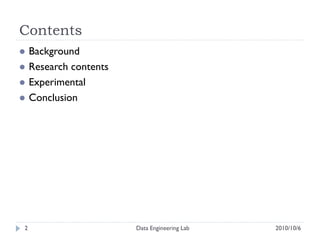 This document proposes an inquiry optimization technique for topic map databases. It discusses using an object-oriented data model for topic map databases to improve query performance compared to a relational model. The document defines cost estimation formulas to help the database system select the optimal retrieval route, either following associations or searching by topic, when answering queries. An experiment is needed to evaluate the effectiveness of using these cost estimations to optimize queries of a topic map database.