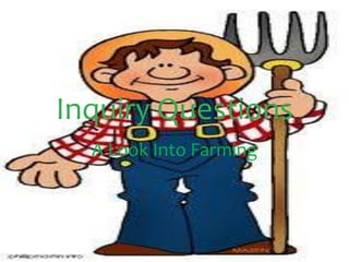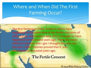 The first farming occurred around 10,000 years ago in areas like China, the fertile crescents of India, Egypt, and Western Asia. The earliest crops grown were wheat, barley, and peas, though the specific crops depended on location. Squash was also grown around this time. The first domesticated animals were dogs, which were used for hunting and protection of human tribes. Dogs evolved from wolves and today there are over 200 purebred dog species.