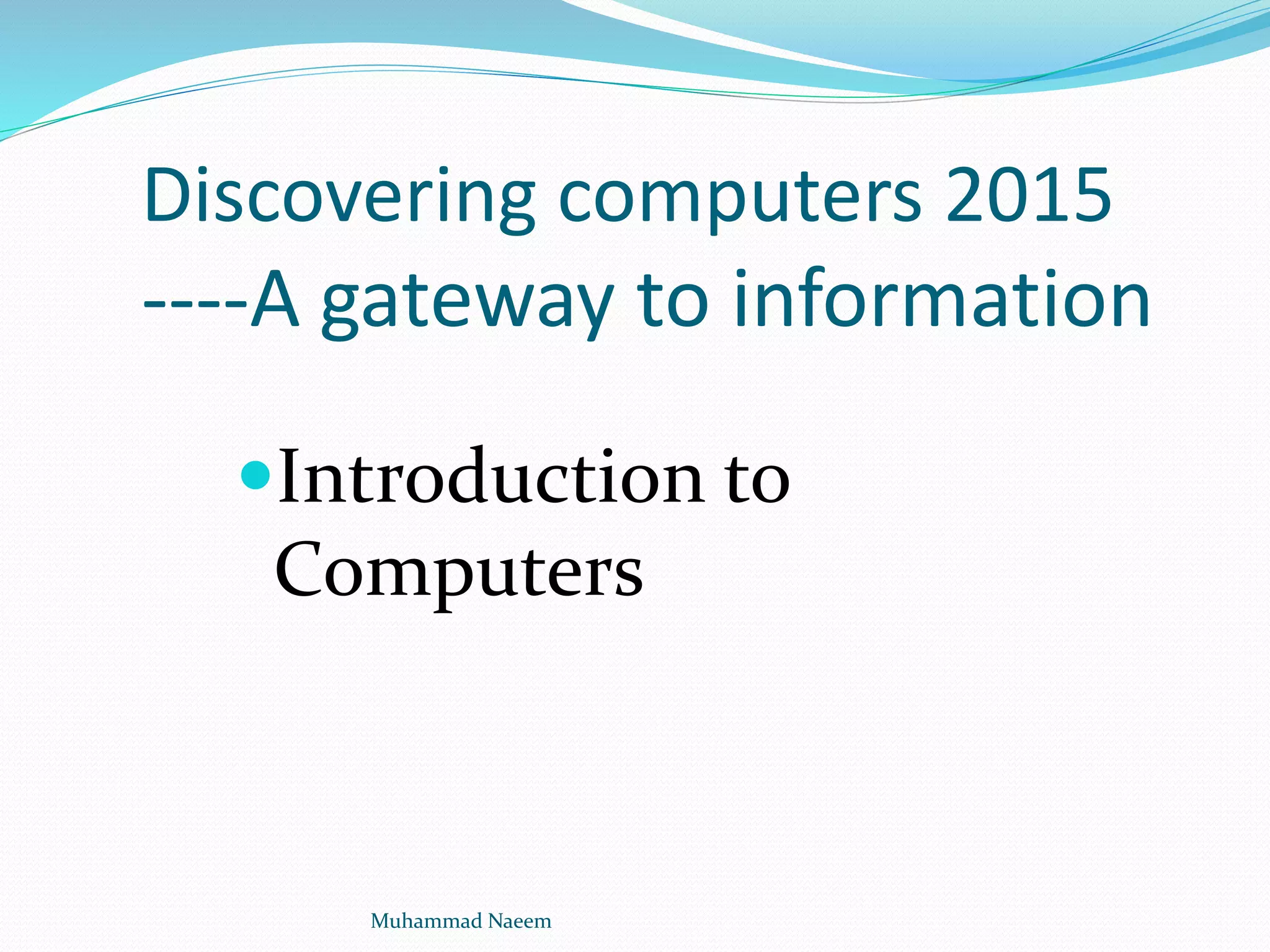 The document defines a computer as an electronic device that accepts data as input, processes it, and produces output according to stored instructions. It describes the basic components of a computer including input devices, output devices, the system unit, motherboard components like the CPU and memory, and storage devices like hard disks, floppy disks, and CDs. The document also discusses what makes computers powerful, how software is installed and run, types of software like operating systems and applications, and the roles of programmers and data representation and storage.