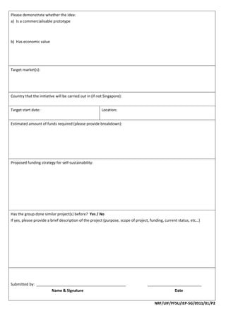This application is submitted by a student group seeking funding for an innovation/entrepreneurship practicum project. The group's project aims to develop a commercializable prototype with economic value, targeting a specific market. If funded, the project would launch on a target start date and location. The group is requesting an estimated amount of funds and has proposed a funding strategy for becoming self-sustaining. They have not conducted a similar project before.