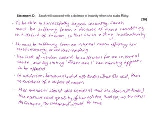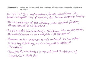 This document discusses the insanity defense and automatism defense in criminal law. It provides examples of cases where these defenses were used and examines how the courts have interpreted and applied the legal tests for these defenses. Specifically, it discusses the M'Naughten Rules for the insanity defense, which require that due to a disease of the mind, the defendant did not know the nature and quality of their actions, or that what they were doing was wrong. It also examines the legal tests for establishing automatism as a defense.