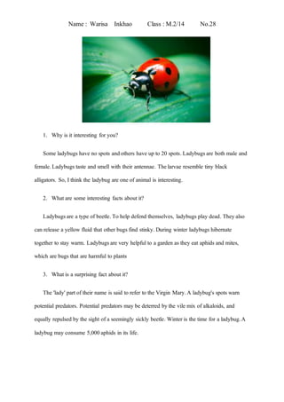 Warisa notes ladybugs come in different colors and spots. They play dead as a defense and release fluids to deter predators. Ladybugs are helpful for eating harmful bugs. Surprisingly, their name refers to the Virgin Mary and their spots warn predators.