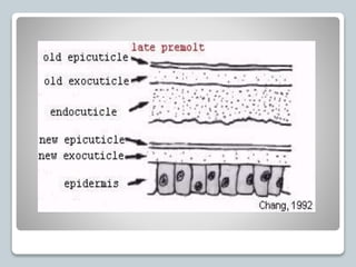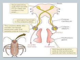 This document provides an overview of neuroendocrinology in insects and crustaceans. It describes the key components of their neuroendocrine systems, including neurosecretory cells located in the brain and ganglia that produce neurohormones. These neurohormones are released into the circulatory system and regulate various physiological processes such as growth, reproduction, color changes, and moulting. The document also discusses specialized endocrine glands like the corpora allata in insects and the X-organ complex in crustaceans that help control these processes through the hormones they secrete.
