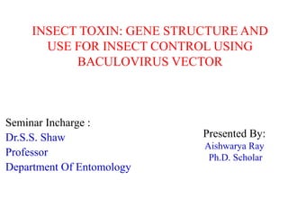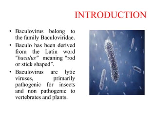 The document discusses baculoviruses, which are lytic viruses primarily pathogenic to insects, detailing their historical influence, structure, and classification. It also covers the mode of action, symptoms of infection, and the baculovirus expression vector system (BEVS) that enables efficient gene expression in eukaryotic cells. Furthermore, it highlights the development of a novel recombinant baculovirus insecticide, Neurobactrus, and the advantages and commercial applications of baculoviruses in pest control and research.