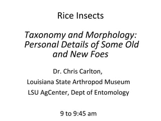 The document presents details on the taxonomy and morphology of various rice insects, highlighting key species like rice water weevils, rice levee billbugs, and pests related to the order Coleoptera, Hemiptera, and Lepidoptera. It discusses the distinguishing features, feeding behaviors, and the ecological importance of lady beetles as natural pest control agents. The text emphasizes the necessity of accurate pest identification and the role of taxonomists and first responders in managing pest outbreaks.