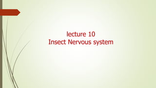 The insect nervous system consists of three main parts: the central nervous system (CNS), the visceral nervous system, and the peripheral nervous system. The CNS contains a brain and a ventral nerve cord made up of fused ganglia. It receives and processes sensory information. The visceral nervous system innervates internal organs. The peripheral nervous system connects the CNS and visceral nervous system to muscles and sense organs via motor and sensory neurons. Together these systems allow insects to respond to their environment and control bodily functions through neural pathways and chemical signaling between different neuron types.
