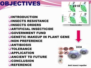 This document discusses insect resistance in crops. It introduces the direct and indirect damage insects can cause to crops. It then covers several topics related to developing insect resistance in crops, including the orders of insects that most damage crops, using genes from Bacillus thuringiensis to generate transgenic insect-resistant plants, and the mechanisms of non-preference, antibiosis, and tolerance that confer resistance. The document also addresses the history of insect resistance, applications of insect-resistant crops, and their benefits for reducing insecticide use and integrating with other pest management methods. It concludes by discussing the importance of insect resistance for protecting agriculture, especially in potential future conflicts, and the need for education on optimal use of insect-resistant crops.