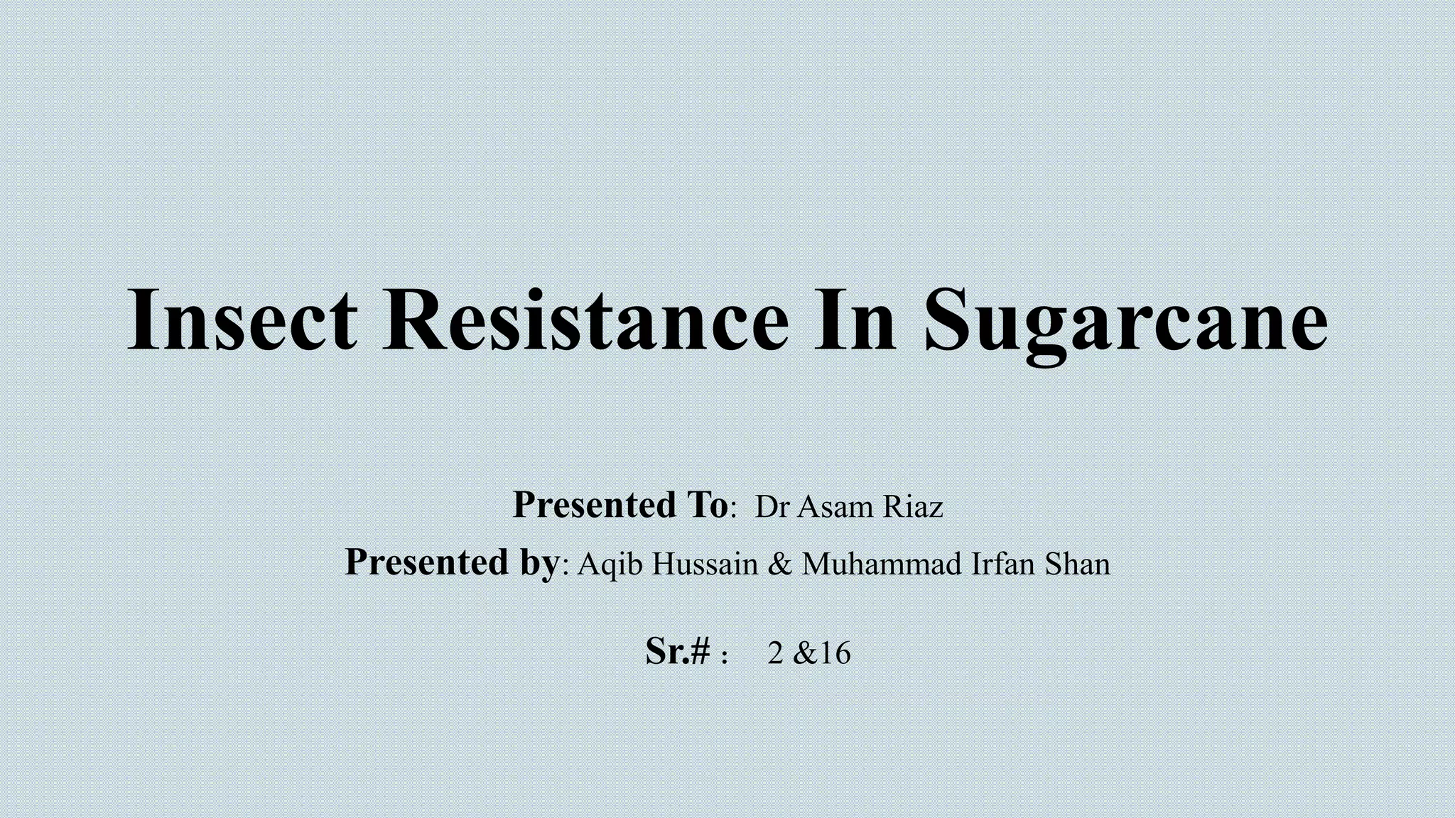 This document discusses insect resistance in sugarcane. It describes three main types of resistance: ecological, genetic, and physiological. The key mechanisms of resistance are antixenosis, antibiosis, and tolerance. Antixenosis deters insects through physical or chemical traits. Antibiosis negatively impacts insect biology through allelochemicals or growth inhibitors. Tolerance allows plants to grow despite insect damage. Both physical defenses like trichomes and waxes, and chemical defenses like secondary metabolites and phenolic compounds contribute to insect resistance in sugarcane.