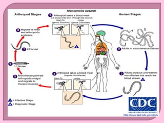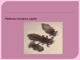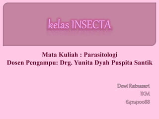 Mata kuliah ini membahas tentang parasitologi. Dokumen ini memberikan informasi tentang beberapa jenis nyamuk dan kutu yang dapat menyebabkan berbagai penyakit, seperti malaria, demam berdarah, dan filariasis. Jenis-jenis nyamuk yang dijelaskan meliputi Anopheles, Aedes, Culex, dan Mansonia, sedangkan jenis kutu yang diuraikan adalah kutu rambut. Diberikan pula informasi tentang ciri-ciri, siklus