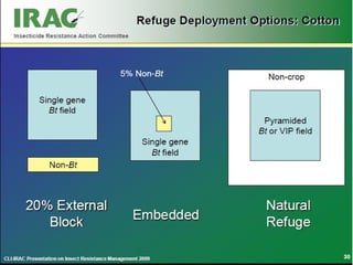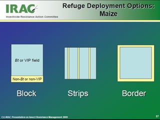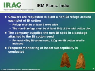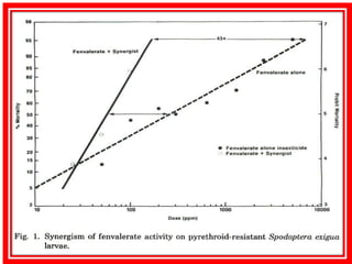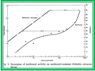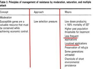 The document outlines strategies for managing insecticide resistance, defined as a heritable change in pest populations leading to ineffective control measures. Key management principles include moderation, saturation, and multiple attack strategies, which aim to delay resistance development by using diverse and integrated approaches. Additionally, it discusses techniques such as insecticide rotation, use of synergists, and incorporation of insect hormones to enhance effectiveness and sustainability of pest control methods.