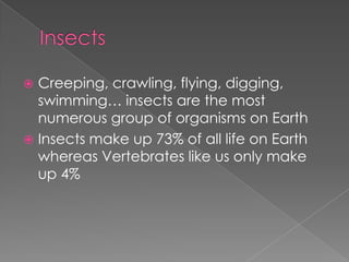 Insects make up 73% of the world's living organisms and have bodies divided into three parts - head, thorax, and abdomen. They go through life stages of egg, larva, pupae, and adult. Insects can eat using mandibles, tube-like mouthparts, or sponge-like mouthparts and move by flying, crawling, jumping, or swimming. While their communication is rudimentary, some argue insects coordinate behaviors through visual cues or behaviors like the bee dance.