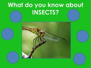The document discusses key facts about insects, including that all insects have 6 legs, 3 body parts, and a pair of antennae. It notes that some insects have wings and can fly, while others do not have wings and walk or jump. The document also mentions that insects have tough, waterproof skin, large eyes, and molt their skin as they grow. It asks questions about what insects eat, whether spiders are insects, and the largest insect on Earth.