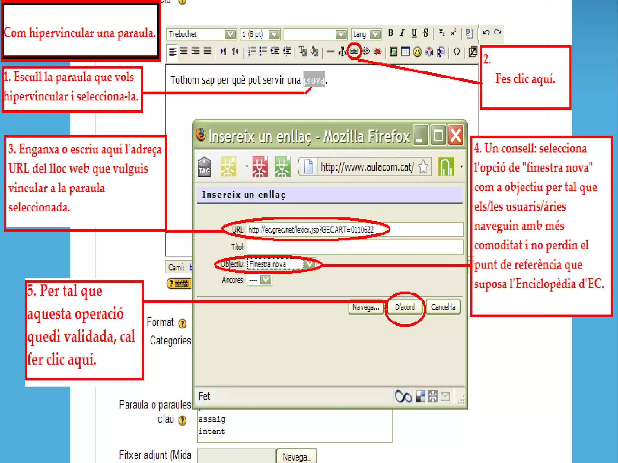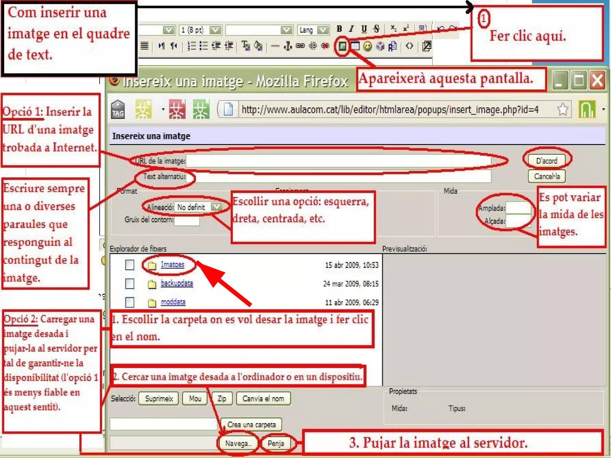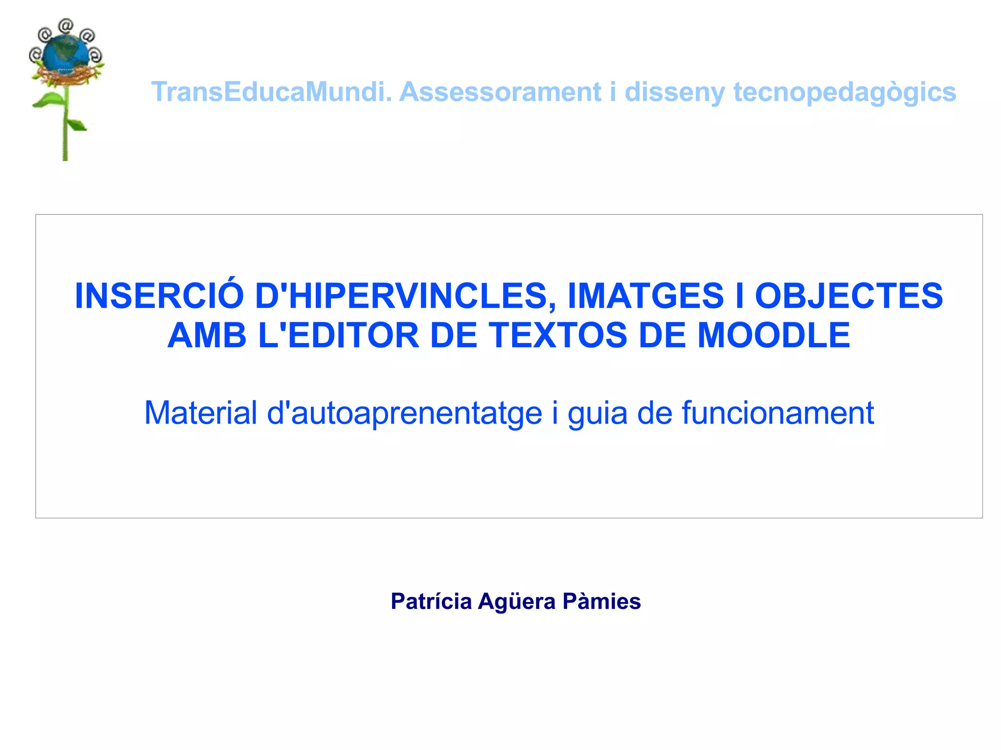 Insercio d'hipervincles, imatges i objectes amb l'editor de Moodle 1. INSERCIÓ D'HIPERVINCLES, IMATGES I OBJECTES AMB L'EDITOR DE TEXTOS DE MOODLE Material d'autoaprenentatge i guia de funcionament OODLE CÓMO EDITAR EL PERFIL PERSONAL DE USUARI@ EN MOODLE Patrícia Agüera Pàmies TransEducaMundi . Assessorament i disseny tecnopedagògics 2. 3. 4. 5. 6. 7. COM TROBAR LA UBICACIÓ (URL) D'UNA IMATGE A INTERNET 8. 9. 10. 11. 12. 13. 14. 15. 16. També es pot inserir de la mateixa manera un arxiu en Flash... 17. 18. Un cop acabem, hem de desar (o enviar, en el cas d'un fòrum) la informació. 19.