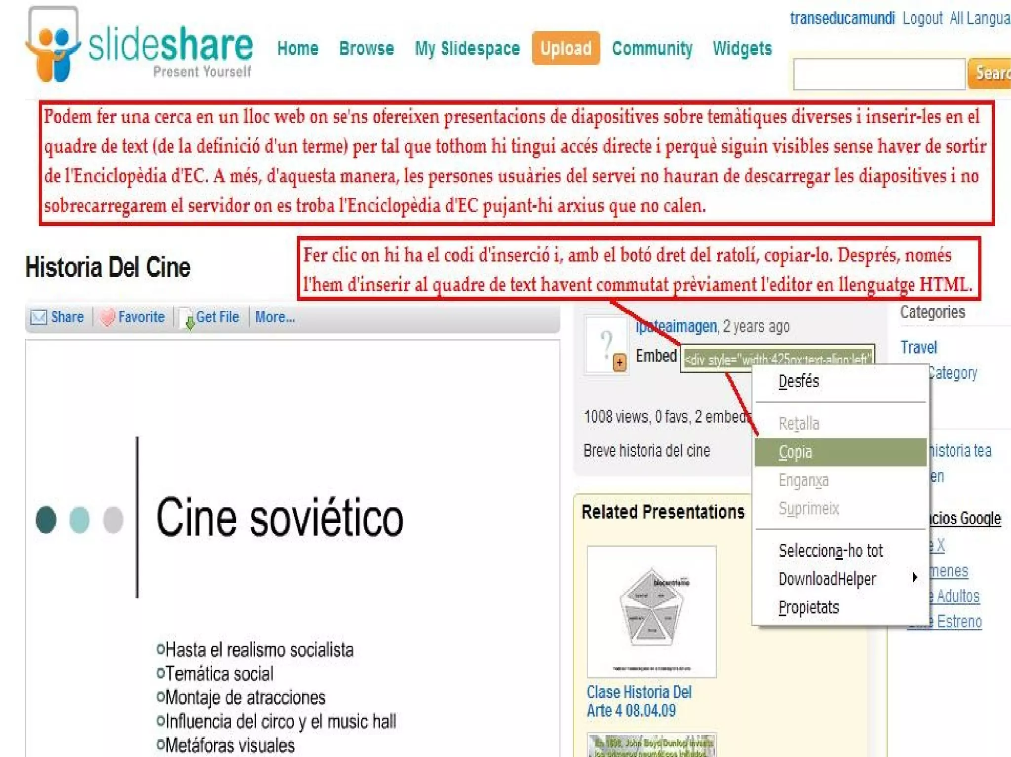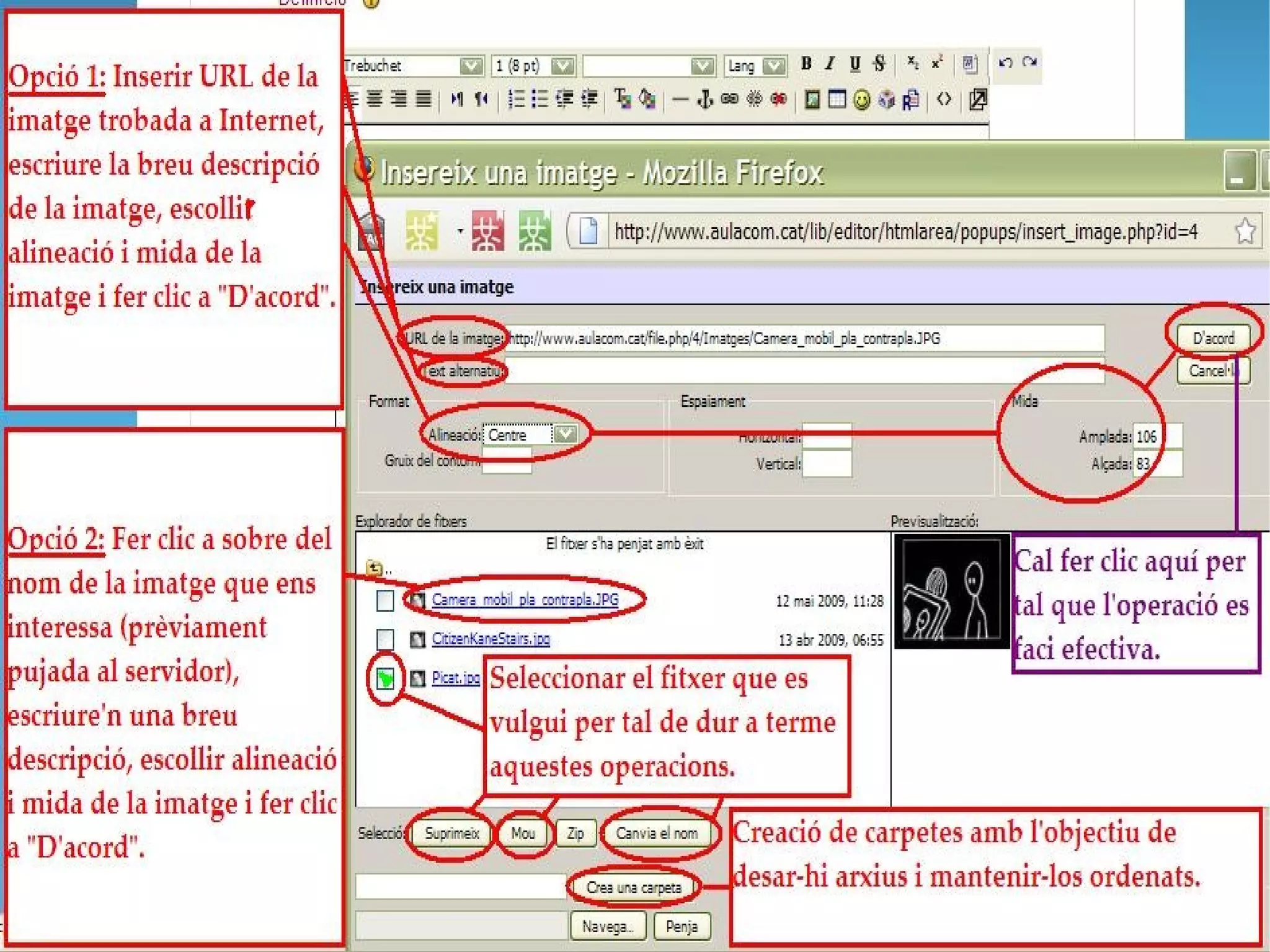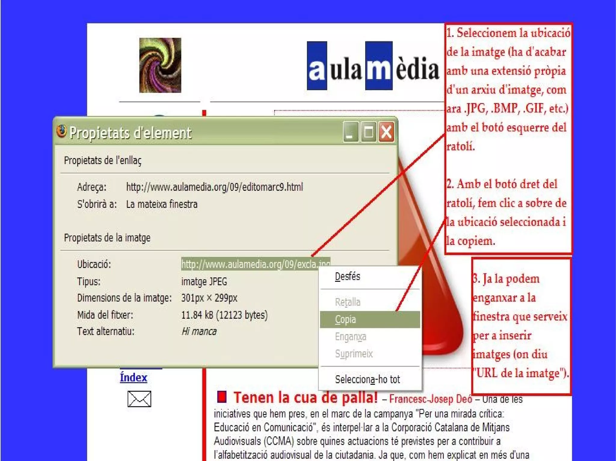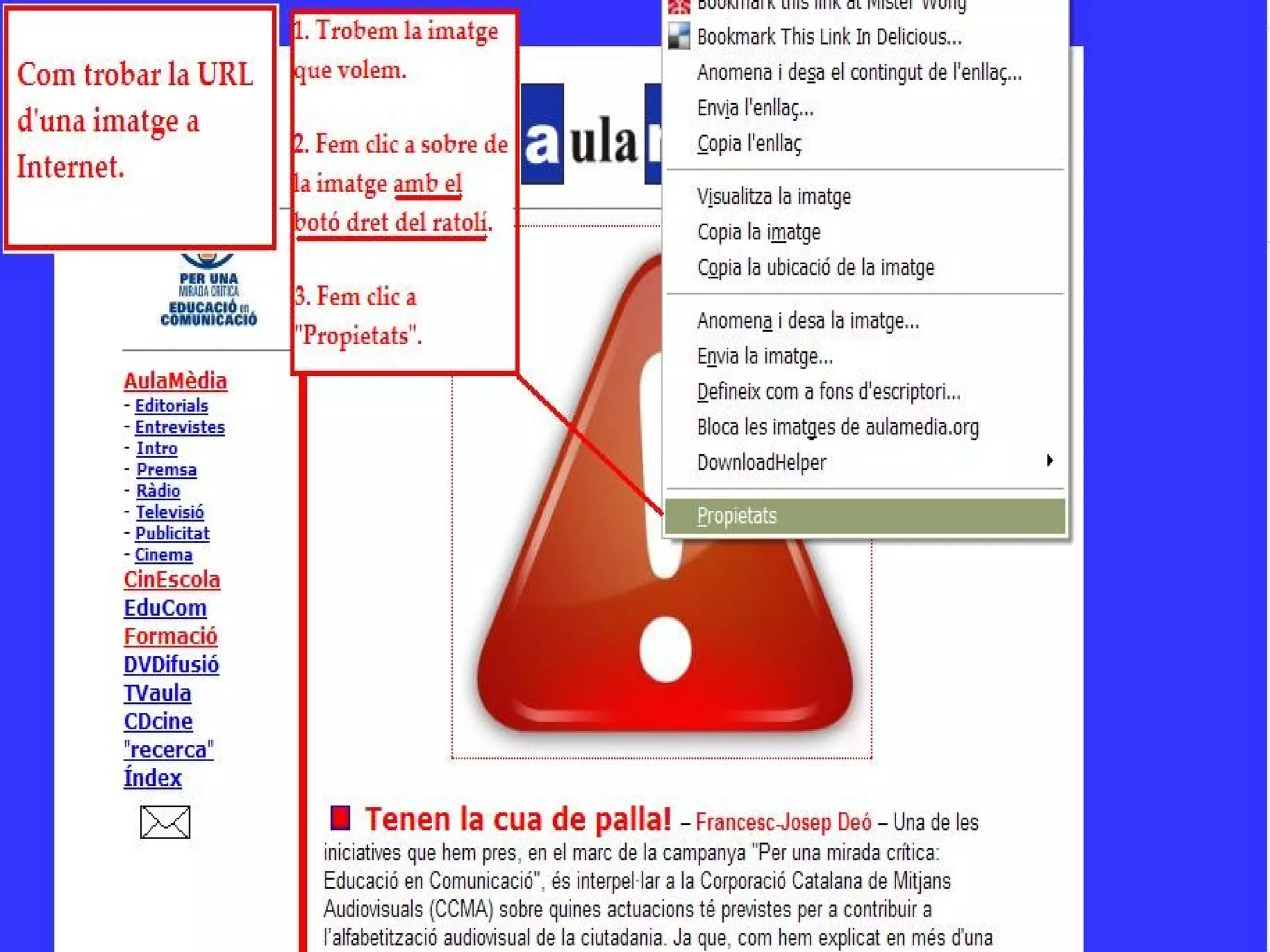 Insercio d'hipervincles, imatges i objectes amb l'editor de Moodle 1. INSERCIÓ D'HIPERVINCLES, IMATGES I OBJECTES AMB L'EDITOR DE TEXTOS DE MOODLE Material d'autoaprenentatge i guia de funcionament OODLE CÓMO EDITAR EL PERFIL PERSONAL DE USUARI@ EN MOODLE Patrícia Agüera Pàmies TransEducaMundi . Assessorament i disseny tecnopedagògics 2. 3. 4. 5. 6. 7. COM TROBAR LA UBICACIÓ (URL) D'UNA IMATGE A INTERNET 8. 9. 10. 11. 12. 13. 14. 15. 16. També es pot inserir de la mateixa manera un arxiu en Flash... 17. 18. Un cop acabem, hem de desar (o enviar, en el cas d'un fòrum) la informació. 19.