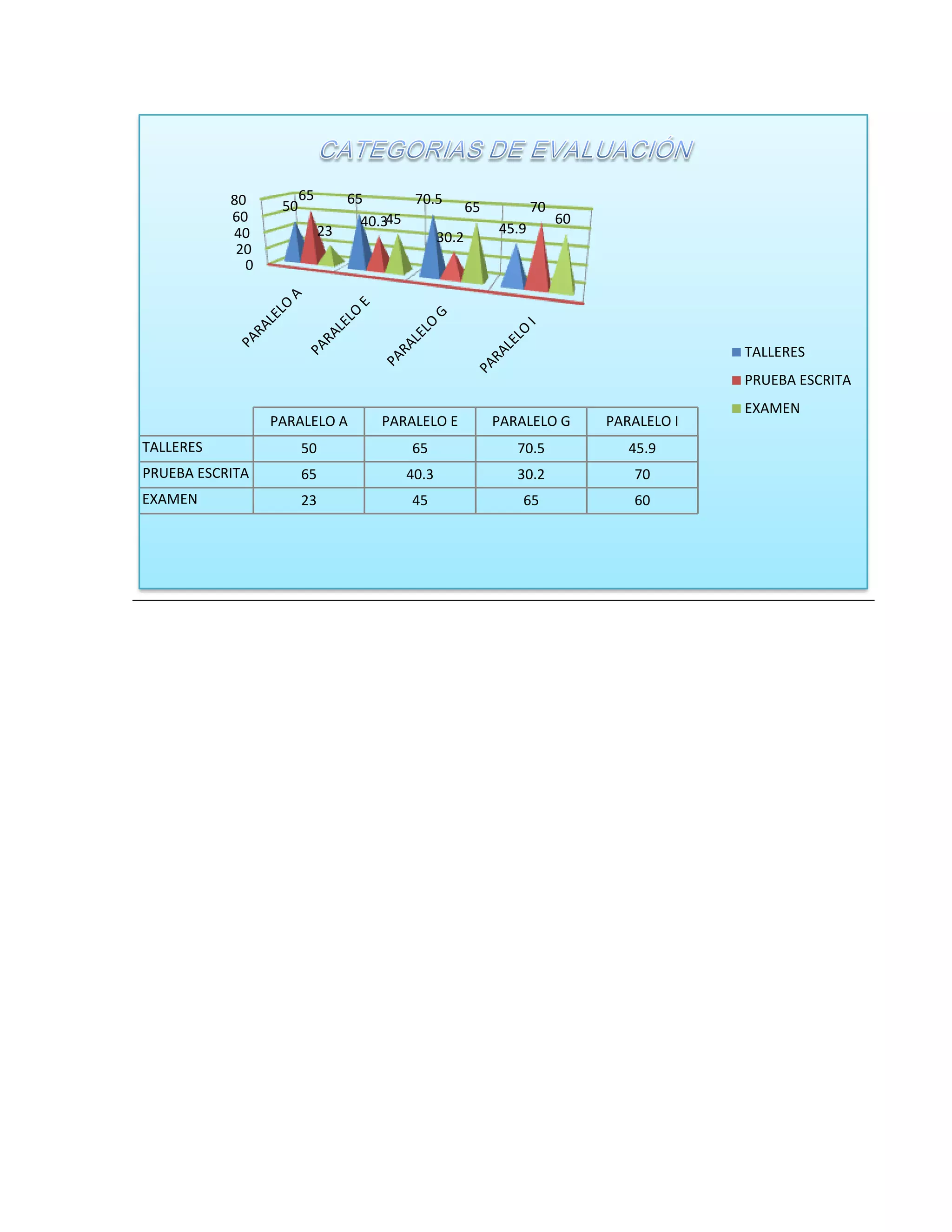 The document contains a bar graph comparing test scores across four parallel classes - Paralelo A, Paralelo E, Paralelo G, and Paralelo I - for three subjects: Talleres, Prueba Escrita, and Examen. Paralelo G scored the highest overall with its highest score of 70.5 in Talleres and Paralelo E had the most variable scores ranging from 40.3 to 65.