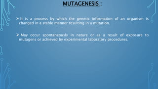 This document discusses insertional mutagenesis, specifically focusing on insertional mutagenesis. It defines insertional mutagenesis as the integration of exogenous DNA into a host genome, which can deregulate nearby genes and alter cellular phenotype. Retroviruses and transposons are commonly used as integrating agents in insertional mutagenesis experiments to identify novel cancer genes. The document describes how retroviruses like MoMLV and MMTV integrate randomly into the host genome and how analyzing common insertion sites from tumors can reveal cancer-causing genes. It also explains the different mechanisms of insertional mutagenesis, such as enhancer insertion, promoter insertion, and intragenic insertion, and how each can alter gene expression