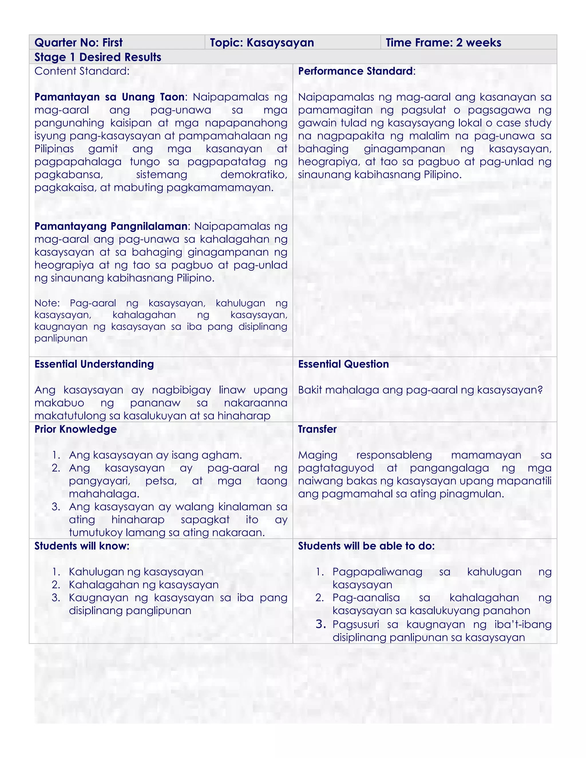 Ang dokumento ay tungkol sa pag-aaral ng kasaysayan sa konteksto ng mga mag-aaral sa unang taon, na naglalayong ipakita ang kanilang pag-unawa sa mga pangunahing kaisipan at isyu ng kasaysayan sa Pilipinas. Nakatuon ito sa pagpapalawak ng kaalaman sa kahalagahan ng lokal na kasaysayan, mga bayaning bulakenyo, at ang interaksyon ng kasaysayan sa iba pang disiplinang panlipunan. Ang mga aktibidad at pamamaraan ng pagpapalitan ng kaalaman ay kinabibilangan ng case study, group discussions, at pagsusuri sa mga news clippings.