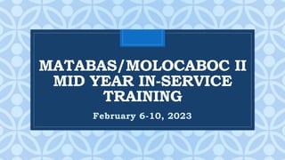 This document outlines the schedule for a mid-year in-service training for teachers. The training will take place from February 6-10, 2023 and will include sessions on the DepEd child protection policy, strategies for teaching 21st century skills, teaching exemplars that integrate 21st century skills, and 21st century assessment approaches. Various teachers and school administrators are listed as leading the different sessions over the 5 day period.