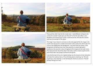 I took several photos for an album cover using different camera settings like 'landscape' and 'flash off' to find the best effect. The chosen photo shows the artist closer to the lens and in focus with the background blurred. The colors in the background are more defined than in natural light, emphasizing the autumn tones that represent the album title 'The Fall' and the earthy natural look sought for the genre. The artist also looks into the distance, making the audience feel he is thinking about something and giving 'The Fall' a dual meaning of the season or falling out of love.