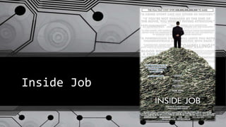 The documentary Inside Job examines the 2008 financial crisis. It analyzes the changes in the financial industry that led to the crisis, including political moves toward deregulation. This allowed large risks to be taken and regulations to be circumvented. The crisis began with rampant lending and investing on Wall Street. Banks financed subprime mortgages and mortgage-backed securities became very profitable. However, the housing prices were inflated in a bubble that eventually burst in 2006-2007 when homeowners began defaulting on loans. Despite signs of growing risks, regulators refused to intervene and the financial system crisis ensued in 2008.