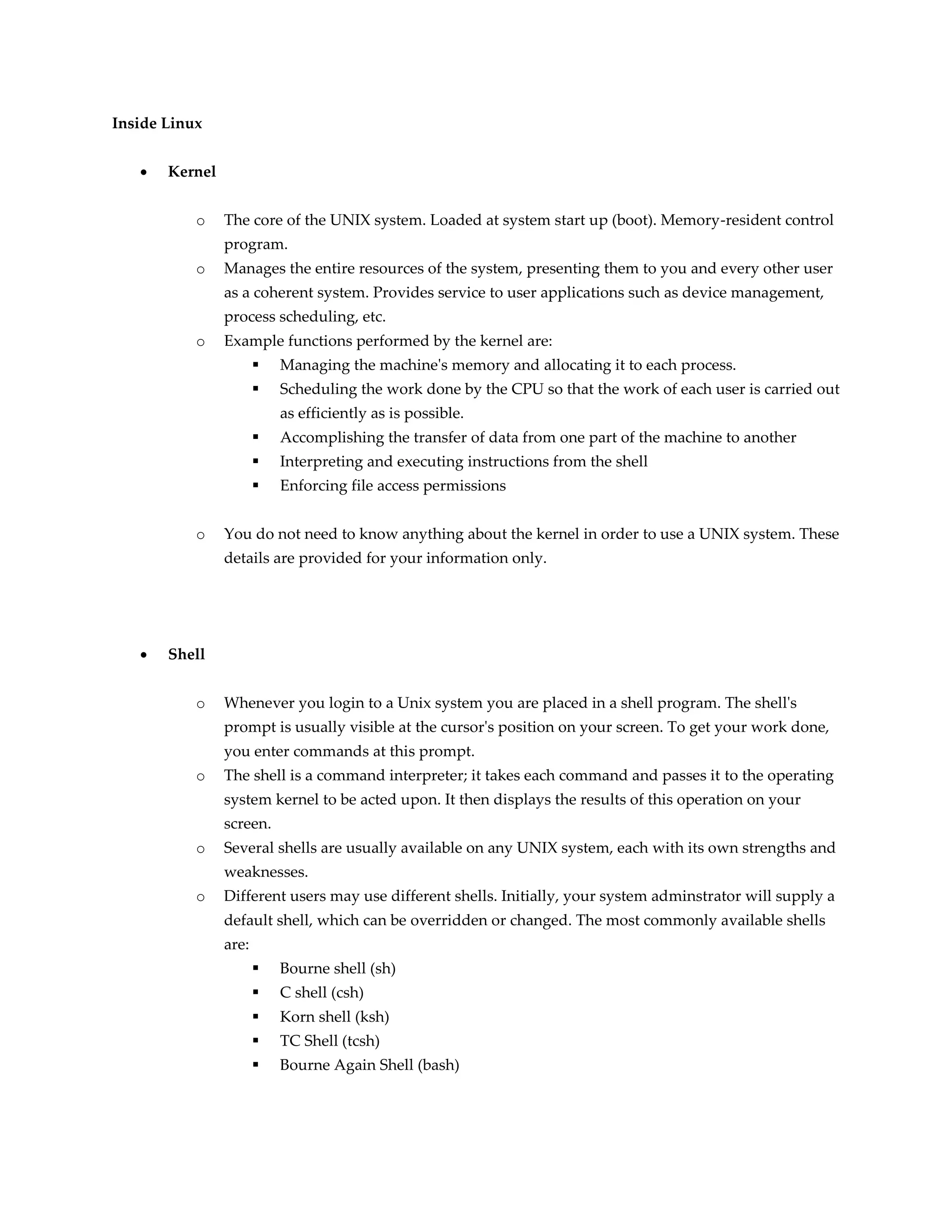 The document outlines the components of the Linux operating system, focusing on the kernel, shell, and utilities. The kernel manages system resources and processes, while the shell serves as a command interpreter for user commands. Additionally, various utility programs provide essential functions for tasks such as editing and file maintenance.