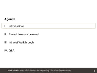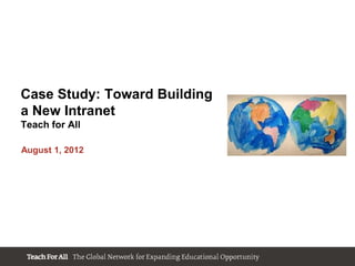 The document presents a case study on the development of a new intranet for Teach For All, aimed at consolidating web portals and enhancing internal collaboration. Key lessons learned include the importance of defining business objectives before technology discussions and involving users early in the process. The intranet was built using Drupal, emphasizing a user-friendly interface and robust content management to meet organizational needs.
