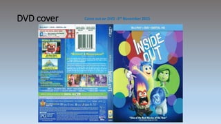 Inside Out summarizes the key details of the 2015 Pixar animated film Inside Out. It was directed by Pete Docter and Ronnie Del Carmen, with a budget of $175 million. The film is targeted at young children and features the voices of Amy Poehler, Phyllis Smith, Richard Kind, Bill Hader, and Lewis Black. It was a major box office success, making $90 million its opening weekend in the US and over $356 million total in the US. The film is available in multiple formats including Blu-ray, DVD, and digital downloads.
