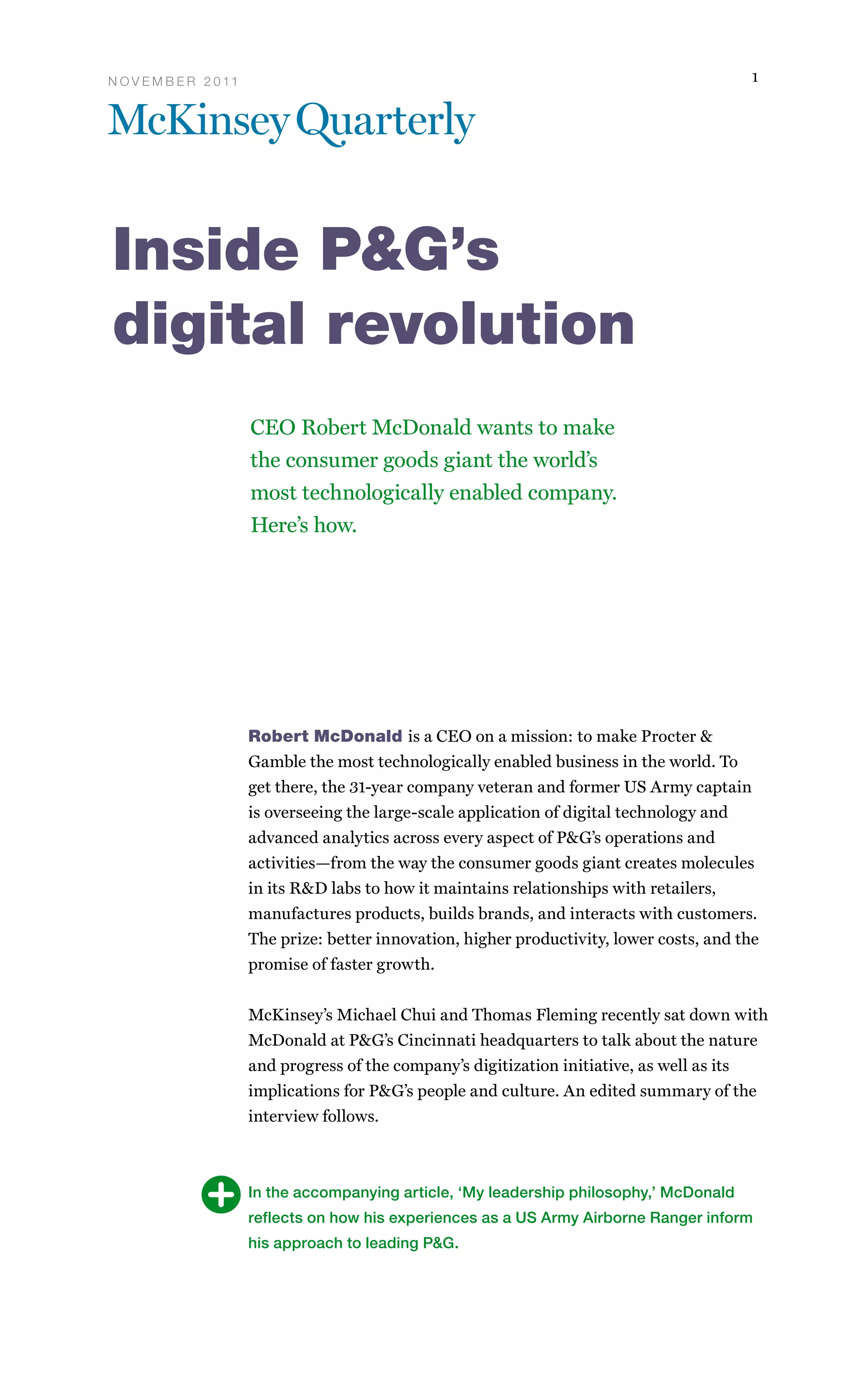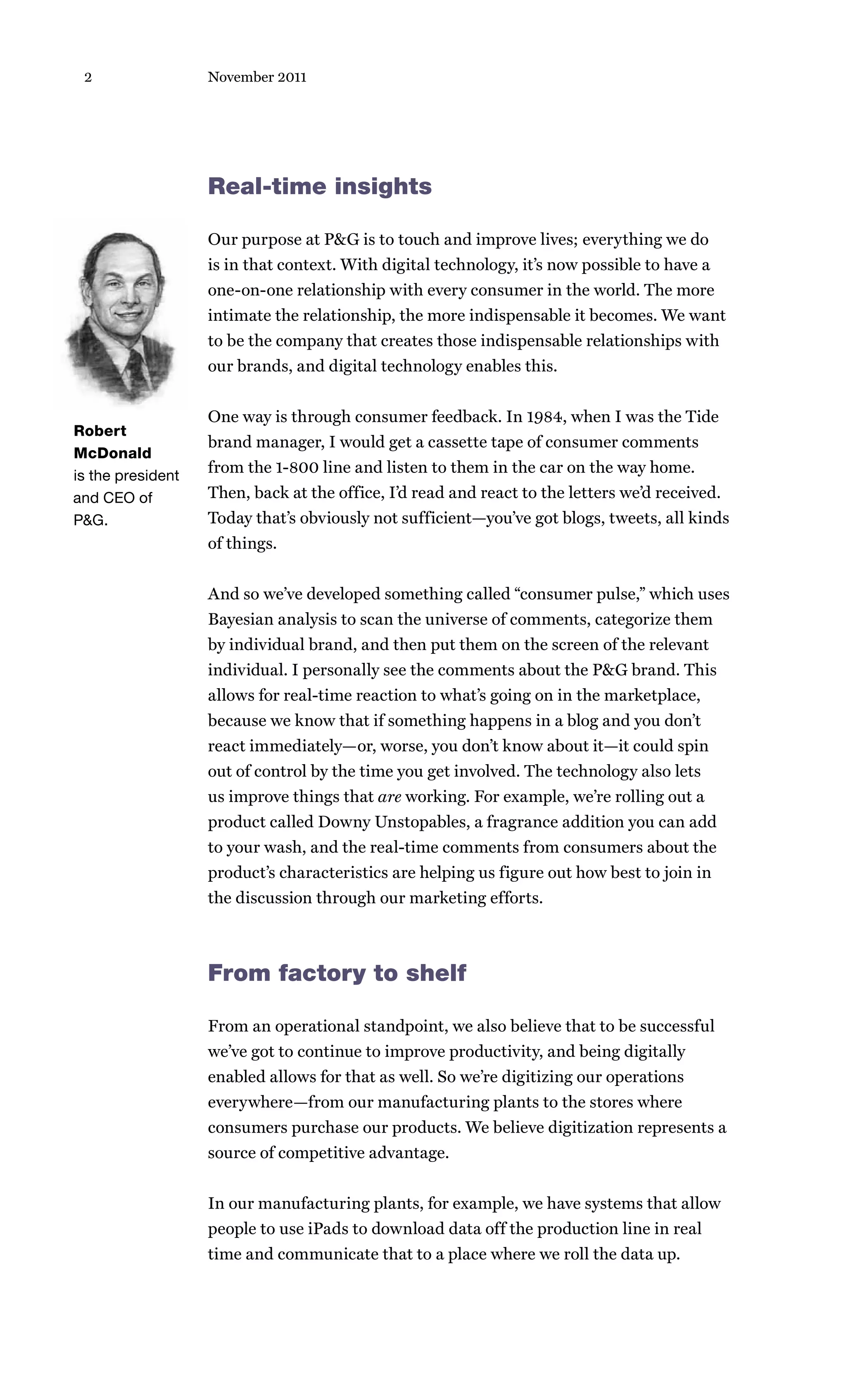 Robert McDonald wants to make P&G the most technologically enabled company in the world. He is overseeing applying digital technology and analytics across all of P&G's operations from R&D to manufacturing to marketing. This includes using real-time consumer feedback and analytics to quickly respond to consumer comments. P&G is also digitizing manufacturing by connecting plants and tracking product costs in real time. McDonald discusses how P&G is bringing technology to retailers globally and using digital tools to speed up innovation like virtual product testing. He emphasizes the need to improve digital skills among P&G's workforce and protect consumer data.