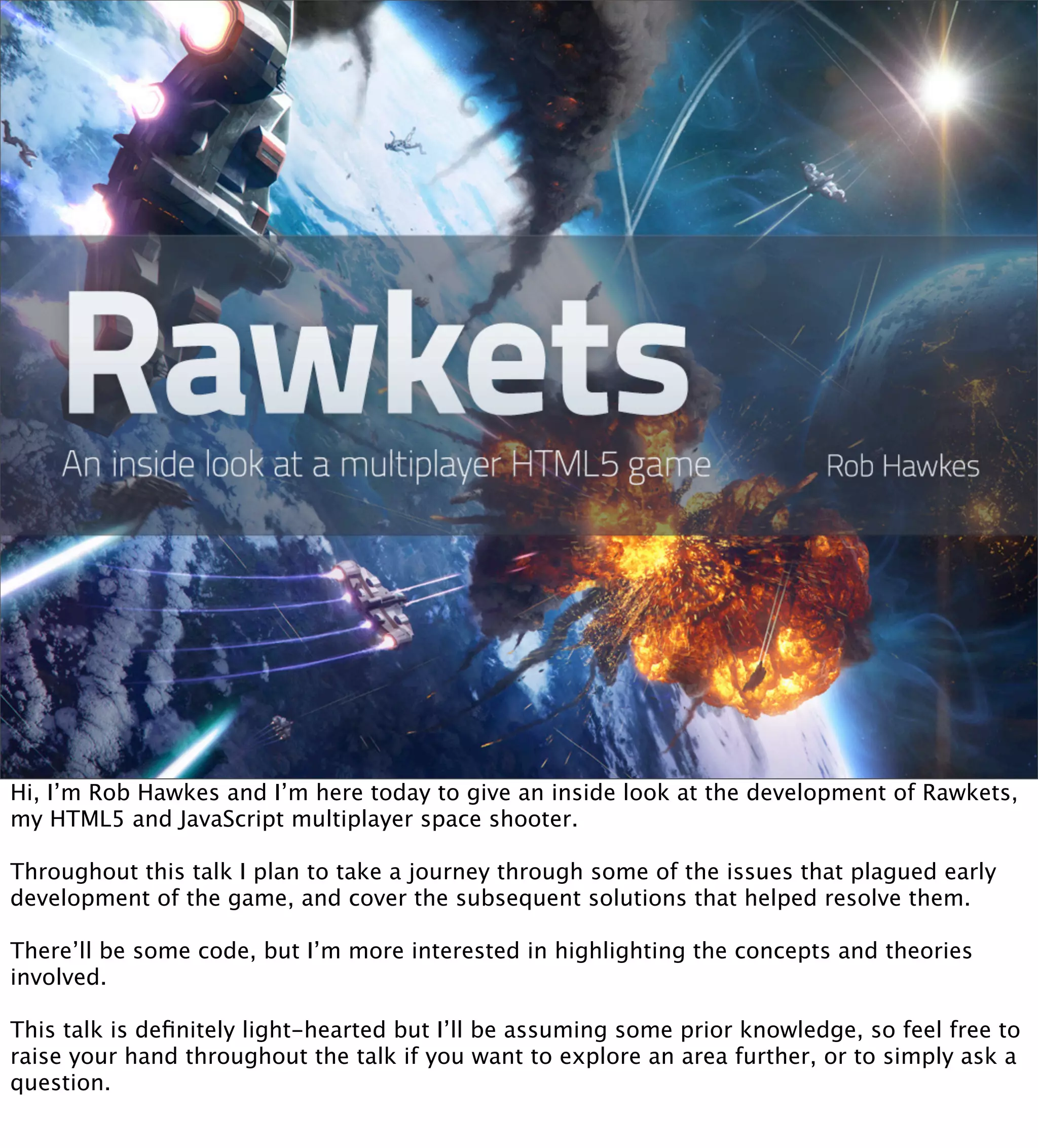 Rob Hawkes presents an overview of developing 'rawkets', a multiplayer space shooter using HTML5 and JavaScript, highlighting challenges faced and solutions applied. Key topics include networking issues, the importance of structured message protocols, and the role of WebSockets and Node.js in facilitating communication. Hawkes emphasizes the need for client prediction to mitigate latency, the advantages of server authority to prevent cheating, and ongoing technological experimentation in game development.