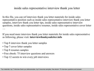 The document provides guidance on writing thank you letters specifically for inside sales representative interviews, including samples, tips, and essential information. It emphasizes the importance of sending these letters promptly, personalizing them for each interviewer, and highlighting key qualifications and enthusiasm for the position. Additional resources are mentioned for further assistance with resumes and interview preparation.