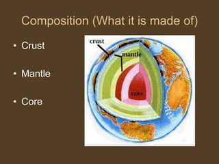 The Earth is composed of three main layers - the crust, mantle, and core. The crust is the outermost layer and is made up of either dense oceanic crust or less dense continental crust. Below the crust lies the mantle, which is the thick middle layer of the planet. The core is at the center and is divided into a liquid outer core and solid inner core, both made primarily of iron.