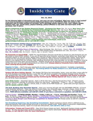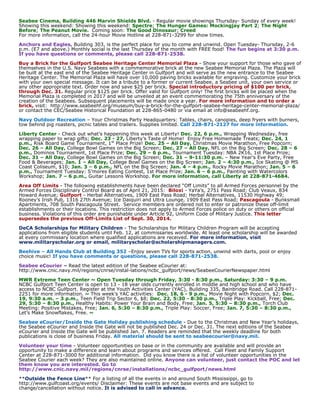 This document provides information about various events, services, and notices at Naval Construction Battalion Center Gulfport over the December 2015 and early January 2016 period. It includes details about chapel services, store hours, fitness classes, movies showing, and more. Contact information is provided for several facilities and events. The document also lists establishments declared off-limits to military personnel and provides a deadline for a scholarship application.