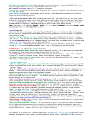 showing at the base theater, and off-base Mardi Gras parades and events in early February. It also lists contact information