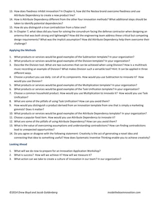 This document discusses a proven system of creativity techniques called Structured Innovation Techniques (SIT) for achieving breakthrough innovation results. It provides discussion questions for practitioners to apply the techniques, including questions about how specific organizations have used subtraction, division, multiplication, task unification and attribute dependency to develop new products and services. The document explores how overcoming barriers like fixedness and addressing contradictions can lead to innovative solutions.