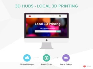 3D Hubs is a network that connects 3D printer owners with customers around the world, allowing on-demand 3D printing locally. It currently has over 3,800 printers in 80 countries. Printer owners can earn money and be part of a community by joining the network. Customers benefit from the fastest delivery and largest selection of printing options.