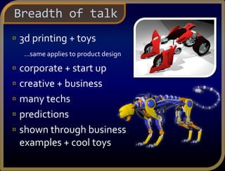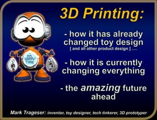 This document discusses the potential of 3D printing for toys and other industries. It begins with the speaker's background working with major toy companies and using 3D printing for over 16 years. The speaker discusses how 3D printing has changed prototyping by making it faster, higher quality and allowing for more complex designs. Examples are given of how current toy companies are using 3D printing. The future possibilities with 3D printing are explored, such as customizable toys and being able to experiment more easily. The document conveys an optimistic view of the opportunities 3D printing provides for inventors and American entrepreneurship.