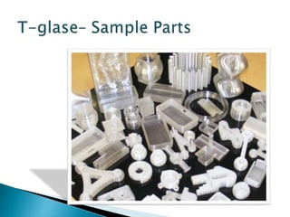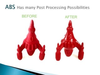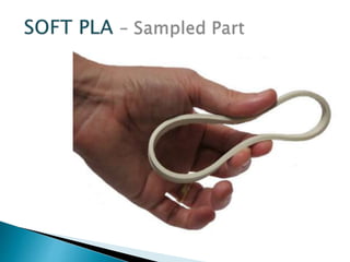 The document discusses various 3D printing technologies and materials. It provides information on common 3D printing materials like ABS, PLA, nylon and describes their properties and best printing practices. Examples of applications are given, such as using ABS to make printer components and polycarbonate for parts requiring heat resistance. Overall guidelines are provided on preparing models and converting them to G-code for 3D printing.