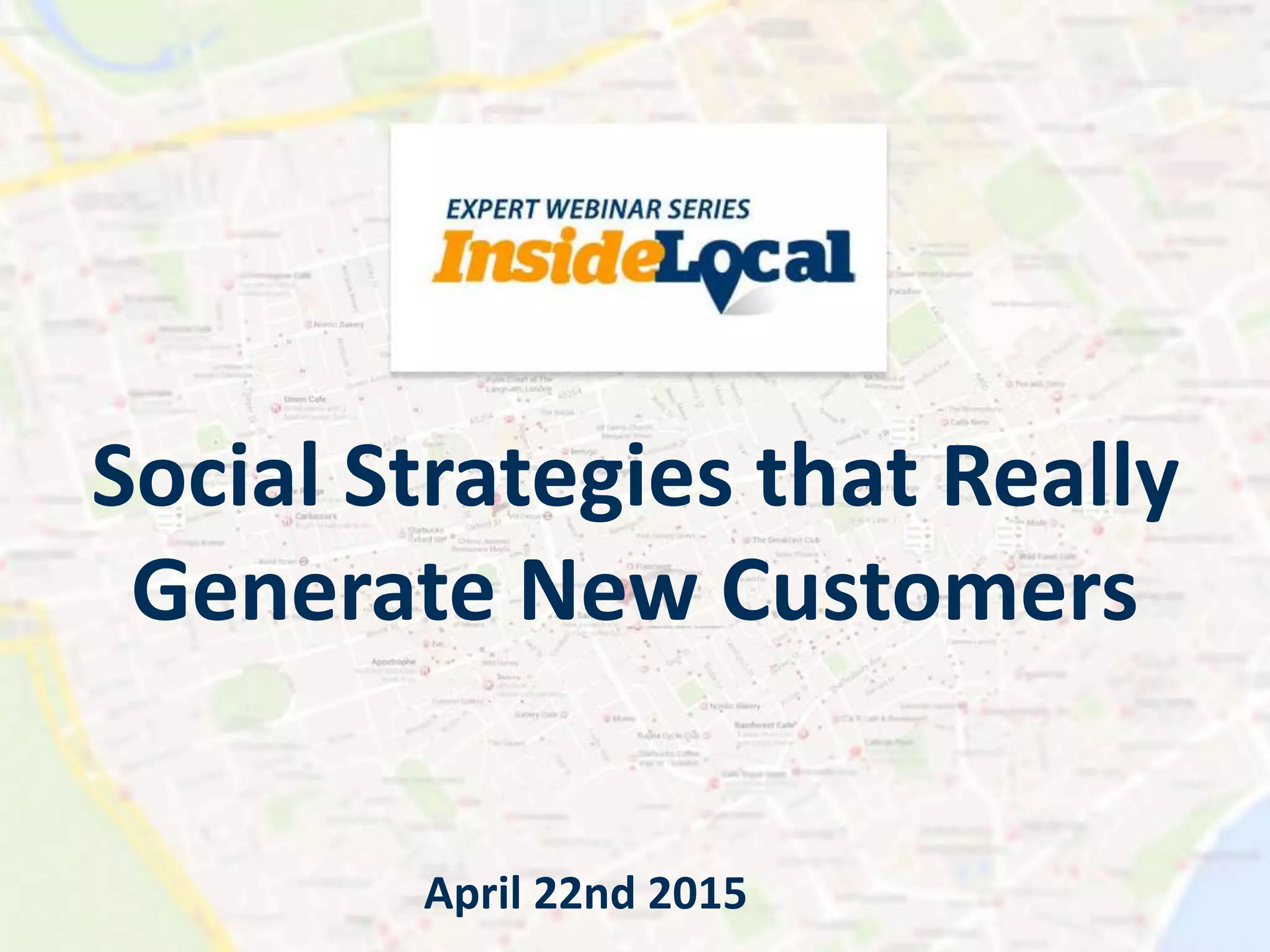 This document summarizes a webinar on social strategies that generate new customers for local businesses. The webinar featured panelists from various social media and local marketing companies and was hosted by Brightlocal.com. It covered topics like the true value of social media, choosing the right content and platforms, and delivering new customers through social strategies. The webinar included polls of attendees and provided resources in the chat. Upcoming webinars on related topics like reviews and reputation, mobile search, and ranking outside your local area were also promoted.