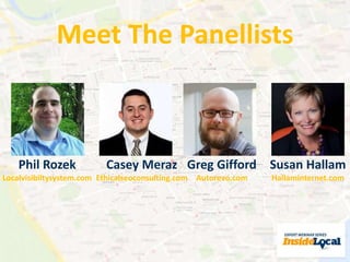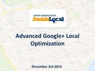 The document outlines a webinar hosted by experts on advanced Google+ local optimization, covering topics such as GMB guideline updates, category selection, and conversion tactics. It includes polls for audience engagement on ROI and focus areas in local optimization, along with a Q&A segment. Additionally, it announces upcoming webinars focused on troubleshooting and best practices in local search for 2015.