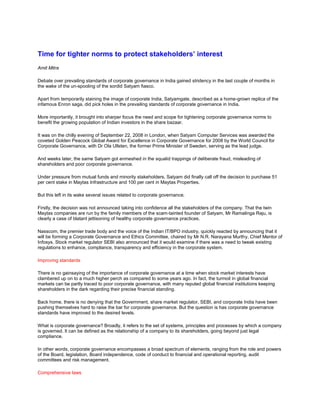 The document discusses corporate governance standards in India following the Satyam scandal. It outlines existing laws and regulations around corporate governance in India, including the Companies Act of 1956, recommendations from industry groups, and SEBI's Clause 49. However, it notes that full compliance with Clause 49 is still lacking in many companies. It argues that independent directors should be held more accountable and that the Satyam scandal highlighted weaknesses in their role and auditors' responsibilities. Tighter rules are needed to strengthen corporate governance standards and better protect shareholders and stakeholders.