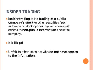 This document discusses insider trading and the case of Hindustan Unilever Limited vs SEBI. It provides details of the legal controversy where SEBI charged HUL with insider trading for purchasing shares in Brooke Bond Lipton India Ltd. two weeks before announcing their merger. SEBI directed HUL to pay compensation to UTI and initiated criminal proceedings against common directors, though HUL appealed and the appellate authority ruled in its favor. The document also covers advantages and disadvantages of insider trading, and the need to regulate it to maintain trust and prevent market manipulation.