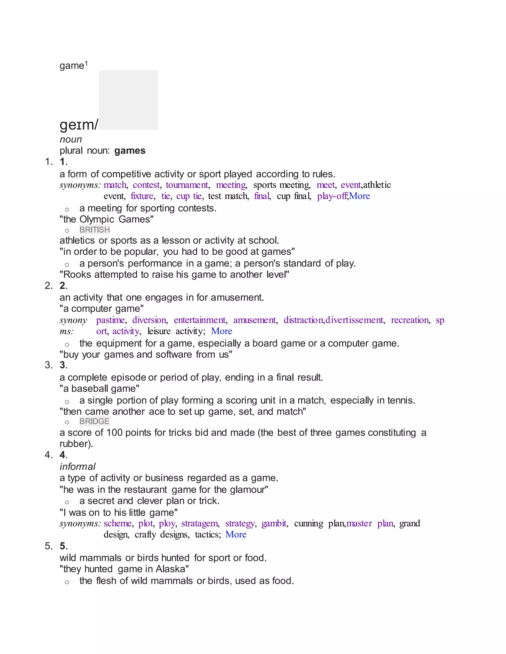 1) A game is a competitive activity or sport played according to rules. It can refer to individual contests, as well as full episodes or periods of play.