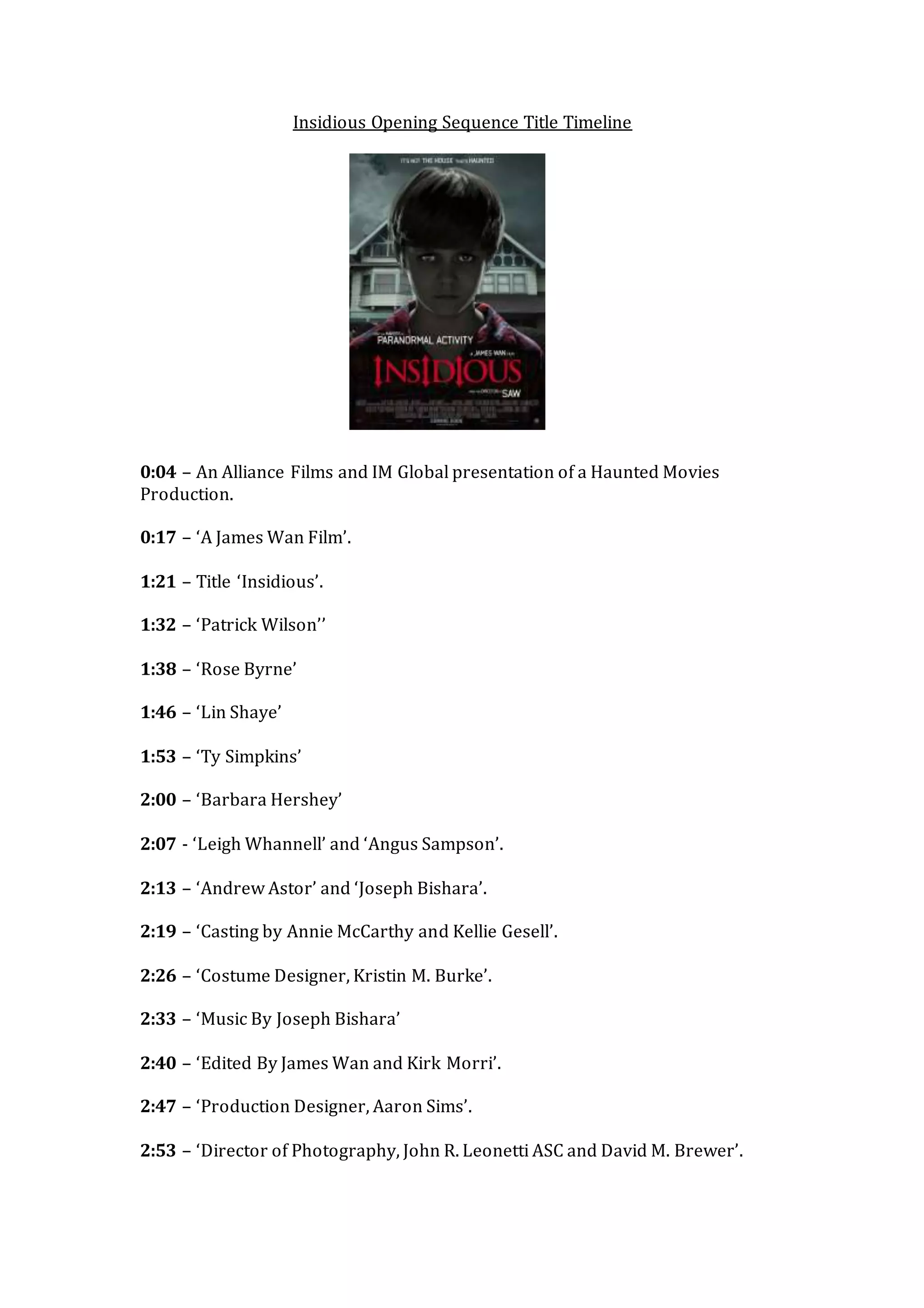 The document outlines the opening sequence and credits of the film 'Insidious'. It includes details on the production companies, main cast members, and key personnel involved in the film's creation. Notably, it highlights that the film is directed by James Wan and features contributions from various individuals in roles such as music, editing, and production design.